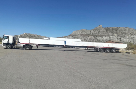 Transporte especial de un puente grúa de 29 metros con plataforma extensible Faymonville.